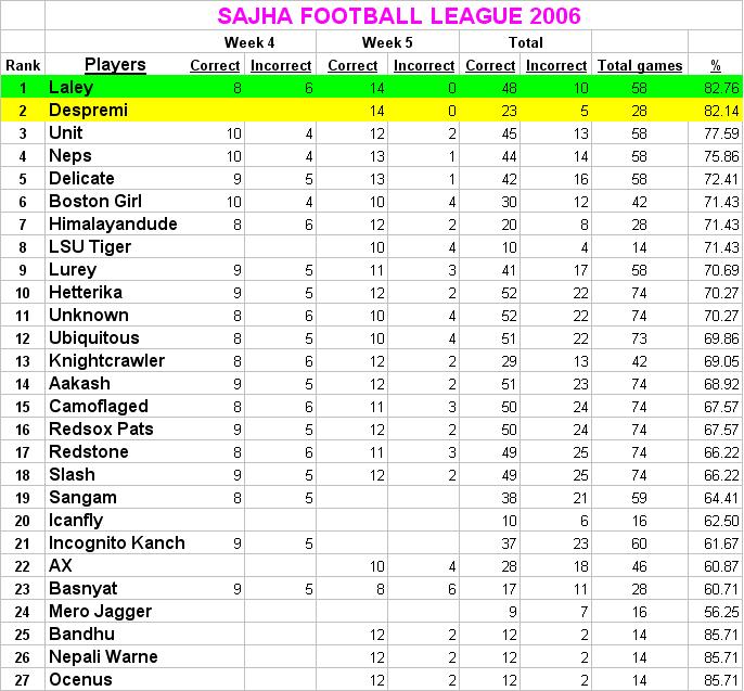 Week 5 results. Laley is the overall winner ........ AGAIN!! :d:d But despremi is there right behind him. *wink* *wink*