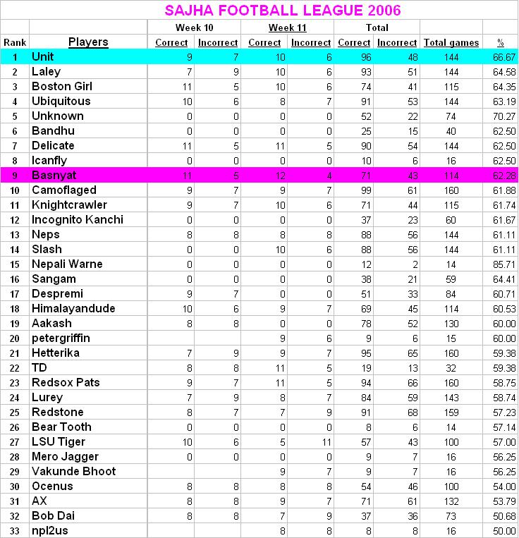 Score update.............. Score update The overall winner is UNIT This weeks winner is BASNYAT these ranks are based on at least 90 games. Here are the results : Atlanta at Baltimore------------------>Baltimore Buffalo at Houston ------------------->Buffalo Chicago at N.Y. Jets ----------------->Chicago Cincinnati at New Orleans ----------->Cincinnati Minnesota at Miami ------------------->Miami New England at Green Bay ---------->New England Oakland at Kansas City -------------->Kansas City Pittsburgh at Cleveland -------------->Pittsburgh St. Louis at Carolina ------------------>Carolina Tennessee at Philadelphia ----------->Tennessee Washington at Tampa Bay ----------->Tampa Bay Detroit at Arizona --------------------->Arizona Seattle at San Francisco ------------->San Francisco Indianapolis at Dallas------------------>Dallas San Diego at Denver ------------------>San Diego N.Y. Giants at Jacksonville ----------->Jacksonville npl2us, welcoem to sajha football league, please use the same format as others are using. Template for next week: Miami at Detroit---------------> Tampa Bay at Dallas------------> Denver at Kansas City----------> Arizona at Minnesota-----------> Carolina at Washington---------> Cincinnati at Cleveland--------> Houston at N.Y. Jets-----------> Jacksonville at Buffalo--------> New Orleans at Atlanta---------> Pittsburgh at Baltimore--------> San Francisco at St. Louis-----> Oakland at San Diego-----------> Chicago at New England---------> N.Y. Giants at Tennessee-------> Philadelphia at Indianapolis---> Green Bay at Seattle----------->