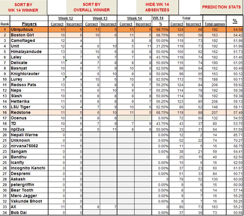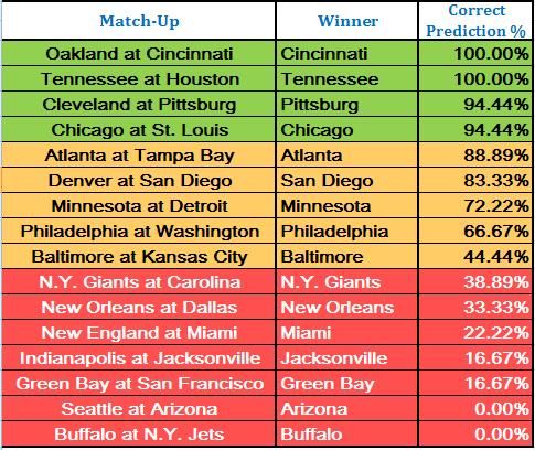 And let's see how were our predictions... As you can see, Top 4 predictions (in Green) were lopsided...meaning, we all did pretty good. THe middle orange has a big variance, but the bottom one is especially awakening...No wonder, The Cowboys, Panthers, Indy, Seattle, andNew England let most of us down... Guys, would appreciate a feedback on if you just want the scorecard, or the additional bells and whistles are ok as well...