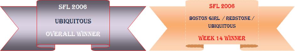Camo Bro: No offense hai...I was just trying to make the spreadsheet clean, and had a macro to auto-hide the "Absentee" of that particular week.....Will include everyone on the next week's result. Unit Bro: I like Denver myself, but do not like the move of putting rookie Jay Cutler in the middle of the season...I think they were better off with Jake for regular season.....Oh, by the way, Defense has not been the same either...Its tough for Denver to get into the playoffs now........Just my two cents.....As long as Cowboys are winning, Its all good ! Atlanta --what can I say, its hard to win with running back as a QB...LOL