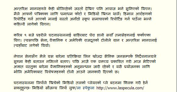 According to Nesw, Pranchanda said: "The UFO is sent by the palace to defame the Maoists. We should immediately delclare Nepal as a republic." Prachanda further said that he smells rat in the whole UFO thing and believes that the Royal Palace should immediately take responsibility of the event.