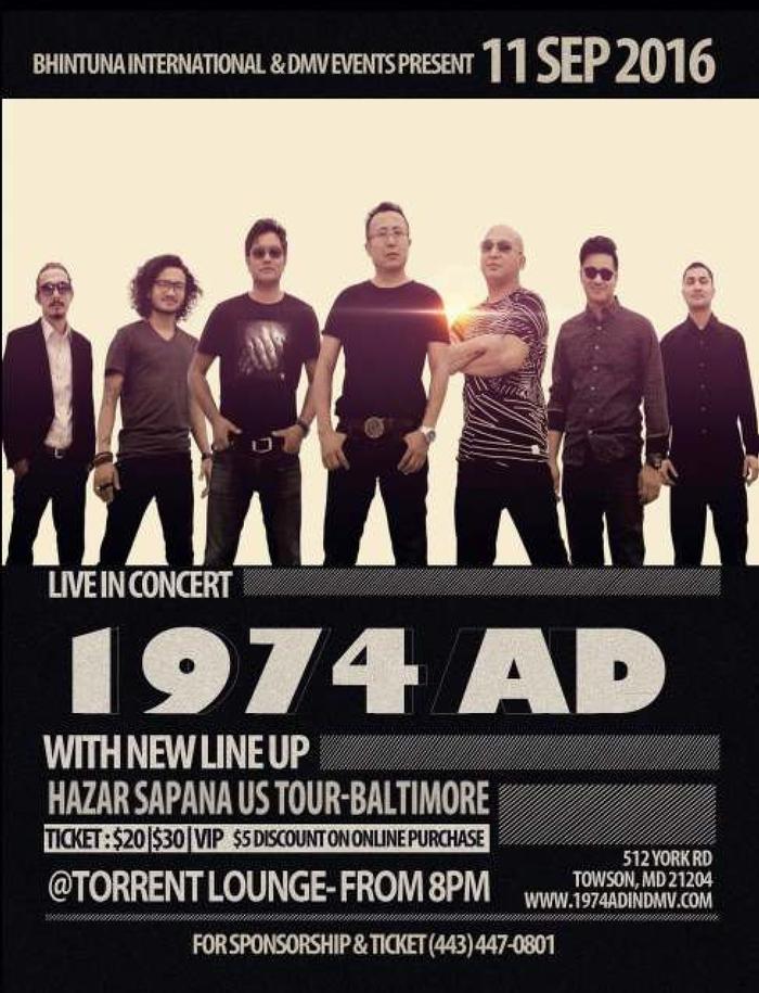 1974 AD is a national Nepali rock band who experiment with various genre of music including traditional Nepali Folk music and western rock music, blues and jazz using a combination of native and western instuments, formed in kathmandu, Nepal in the early 1990s. They are the finest band of Nepal and are touring USA with a new line-up and with a new album release HAZAR SAPANA.