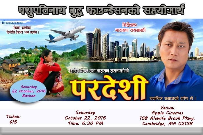 Namaste Everyone,Please join,one of the most popular Nepali Movie “Pardeshi” screening in Boston On Saturday October 22, 2016 by Pashupatinath Buddha Foundation of New England.