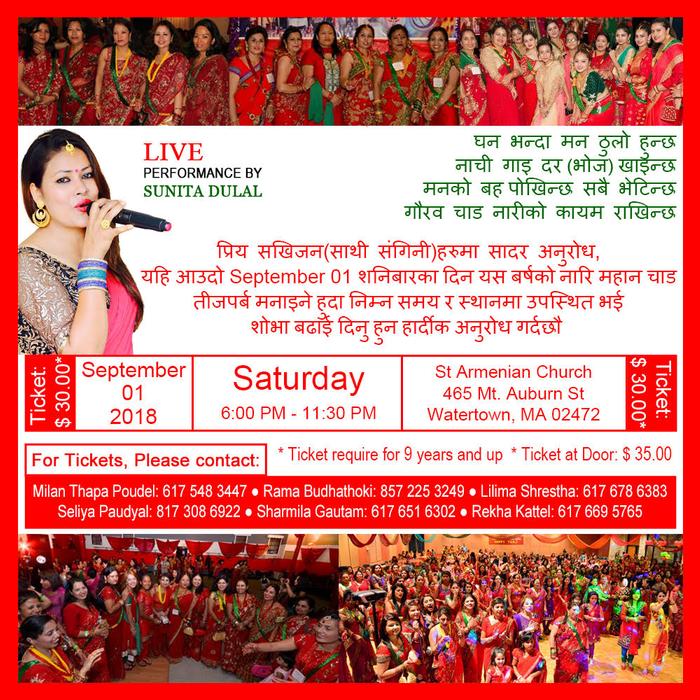 We would like to invite all Didi Baini and Aama, Hajur aama to join us for Teej celebration 2018 with Boston women’s group. LIVE performance with our very talented, sweet and lovely singer Sunita Dulal.